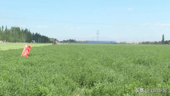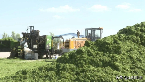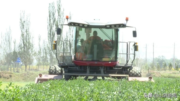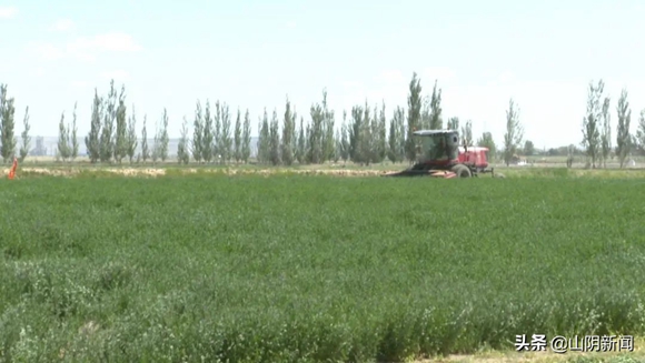 初夏時節,山陰縣的萬畝苜蓿種植基地已經進入收割期,連片的紫花苜蓿流青溢翠,收割機、減濕機在田野上來回穿梭,劃出一道道美麗的線條,呈現出一派豐收景象。下面,我們隨鏡頭到現場看一看。