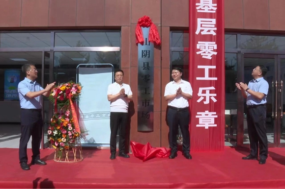 高瑞龍和市人社局黨組書記、局長(zhǎng)李全勝為“山陰縣零工市場(chǎng)”揭牌。
