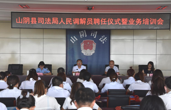 8月3日上午,山陰縣召開人民調解員聘任儀式暨業務培訓會,聘請133名優秀網格員為人民調解員,縣委政法委常務副書記白永平,縣司法局局長高海,縣法學會專職副會長劉躍玲及相關人員參加。